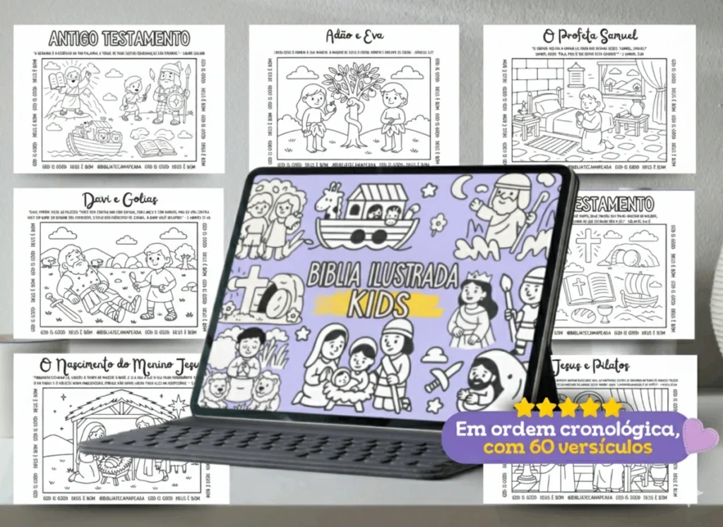 Inspirado no sucesso Bobbie Goods — um fenômeno que ganhou os lares com desenhos terapêuticos e acolhedores — nasceu a biblia ilustrada kids: uma coleção cristã com 65 desenhos para colorir,mais 4 e-books bônus, do Antigo ao Novo Testamento.